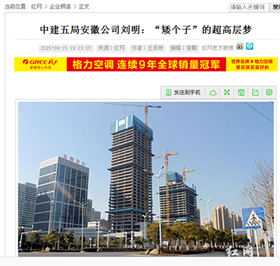 4月15日,一篇题为《“矮个子”的超高层梦想》被全国知名媒体红网发表。紧接着,新浪网、网易新闻、东方网等十多家全国知名媒体纷纷进行了转载报道。伴随着这篇报道的传播,中建五局安徽公司的80后项目副总工程师刘明“火了”。
