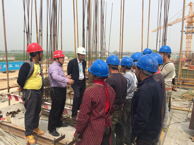 在施工现场,苟水平对正在进行外架作业的班组人员以及项目部的安全监督员和技术员,与中建总公司《2014年施工现场安全质量标准化施工图集》和现场施工方案相结合,采用通俗易懂的语言对悬挑脚手架安全技术操作规程及安全注意事项、局标准化、局红线管理进行一一交底。现场作业人员纷纷表示受益良多,将会继续严格遵守操作规程、服从管理,执行方案。