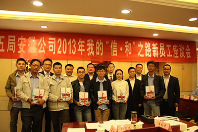 随后,公司综合办主任刘致富带领大家学习了鲁贵卿董事长在2013年五局人才工作会上的讲话。会上,与会领导们还为每位新员工发放一本《我们的“信·和”之路——安徽公司2013年新员工感悟“信·和”征文集》。