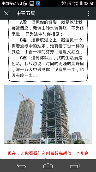 尽管在过程中也曾遇到过挑战,但是这支队伍一路过关斩将,攻克了一道又一道难题,渐渐形成了“超高层精神”,也总结提炼了一套超高层经验。目前,在这支团队的拼搏下,C2已经封顶,C1也已建至217米。过程中,该项目也涌现了多项亮点特色工作,也就是微信中所提到的六大“嫁妆”:一是最大人工挖孔桩。C1主楼基础人工挖孔桩合计54根,其中24根单根直径3.8米,深为50米,综合起来是全国最大的人工挖孔桩;二是地源热泵供热系统。一共钻井数410口,双U型埋管810根,井深105米,埋管总长193200米。冷热源共2台机组,每台机组制冷量1758KW,制热量1800KW,是安徽省首批应用的;三是北斗卫星定位系统。在建筑物的四个角落里分别安装了一个北斗接收器,可以全方位查看钢结构的安装,定位外轮廓尺寸,可精准的将垂直误差降低到5毫米以内。四是爬模与电梯井提升平台组合系统。爬模优化为外爬内散拼的形式,筒内使用定型电梯井提升平台配合散拼木模板作业,效果良好高峰期可达5天/层,筒内水平结构同步施工,避免了筒内水平结构2次施工,且一次性爬升成功;五是自动养护喷淋系统。它可以形成水雾,喷洒均匀,一方面可以减少污染,另一方面也使得混凝土面在质量上可控,也从根本上解决了超高成外墙质量通病养护的困难;六是悬臂式拉索幕墙。通过绳索与钢梁连接,纵横交错一共153点,跨度为26米,最大高度42米,是为全国首例超高层高空应用。