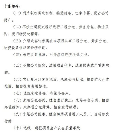 此外,该规定内含项目管理《十条禁令》,从生产安全管理到项目管理人员廉政从业行为规范,再到项目文件签署等工作流程都进行了严格的规定,明确规定了十条命令禁止的行为,进一步规范了项目管理人员的活动规范和项目管理的具体流程,可视为项目管理的“红线”,任何人不得触碰,否则将予以经济处罚、调换岗位、免除职务的处罚。