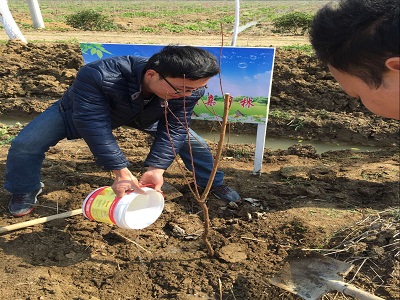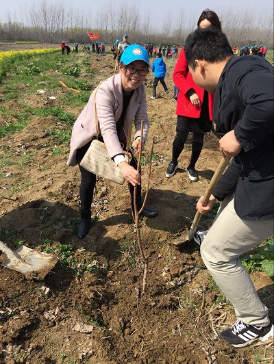 项目青年们与小学生们相互配合、明确分工,有的挖土,有的扶苗,有的培土,各个环节有序,配合默契,充分发扬了团结、互助、有爱的精神。很快,一大片荒草遍布的土地上“长出”了100棵小树苗。