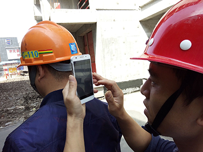 项目安全员吴彬正在用手机扫描工人安全帽上的二维码查看信息